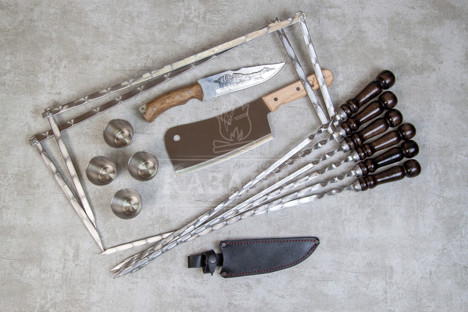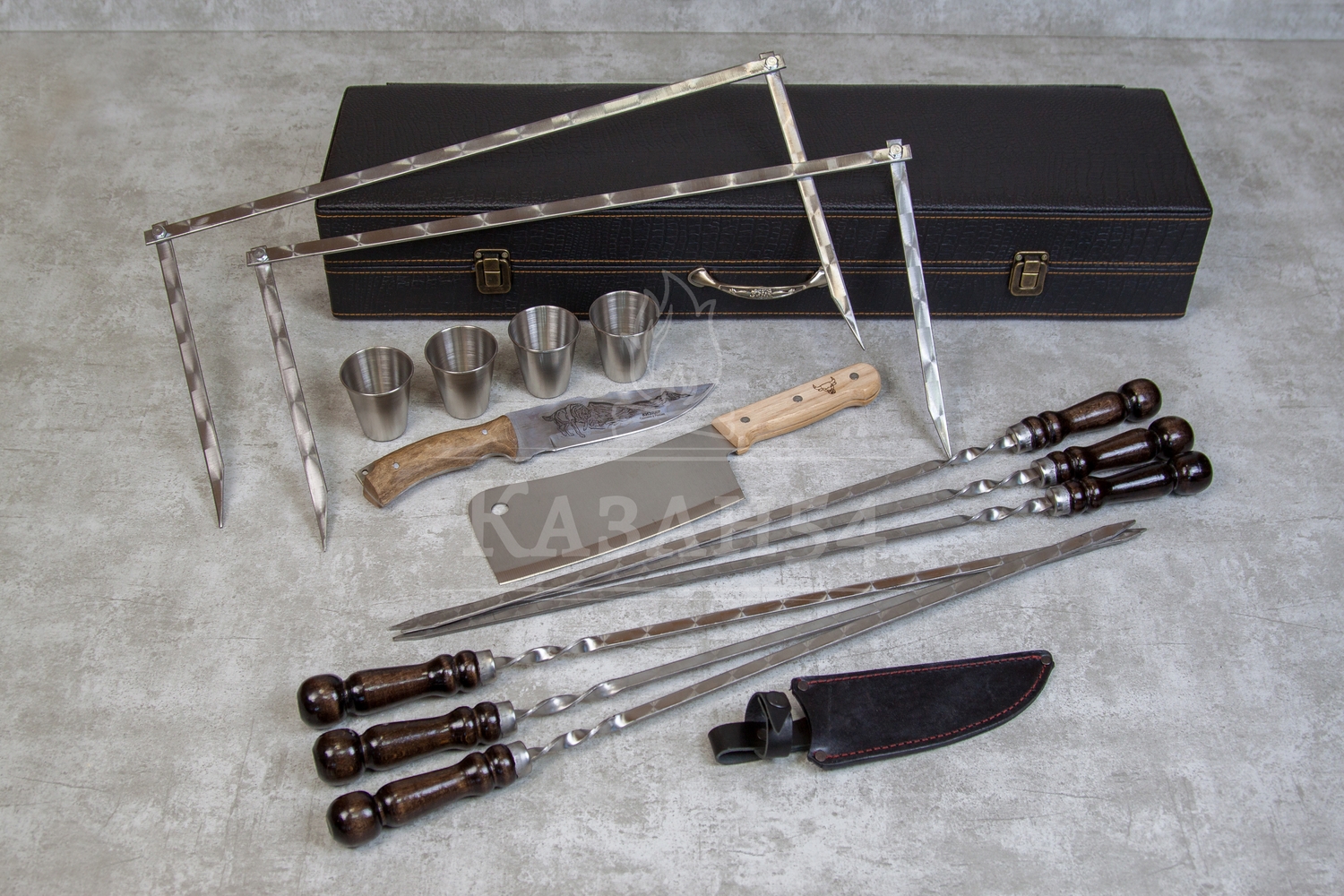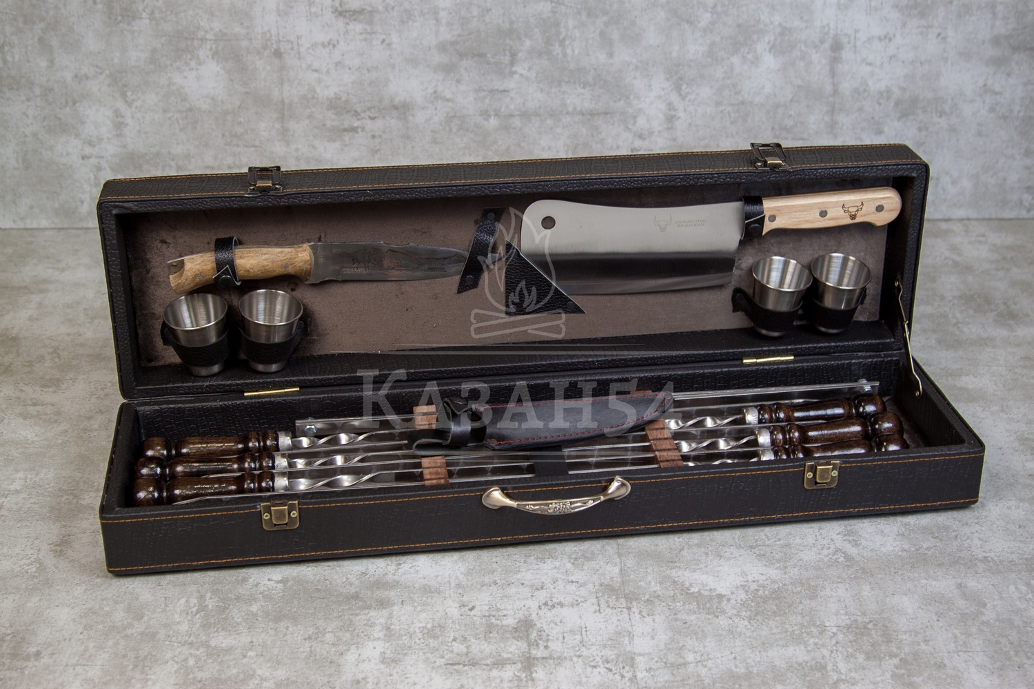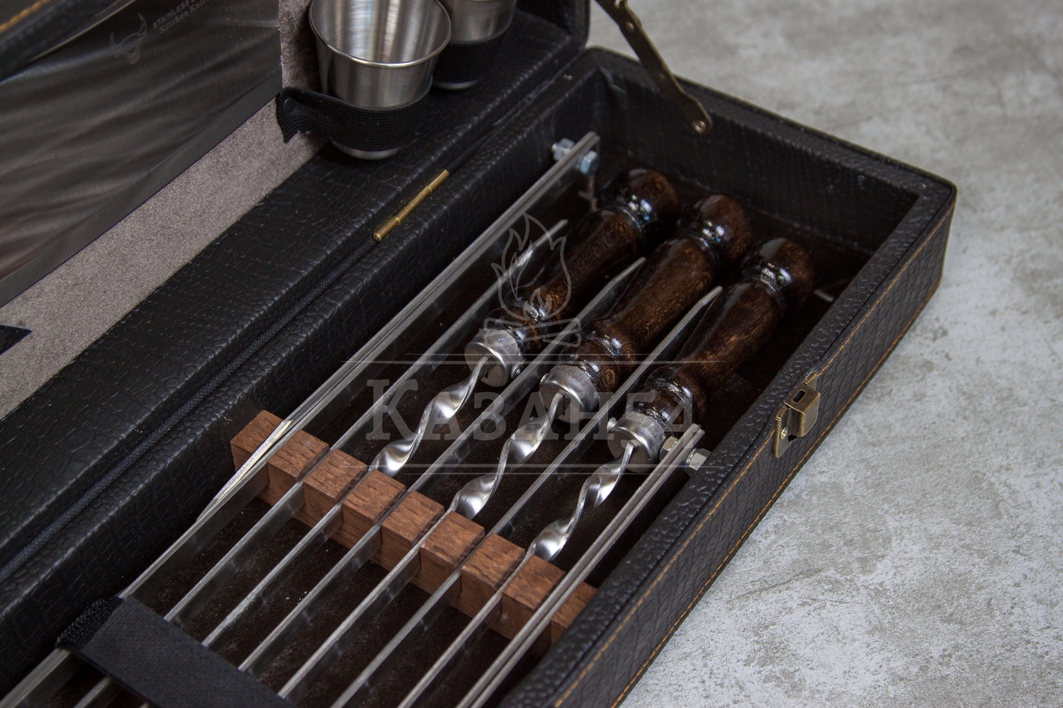 Наборы шампуров из серии Элит средний отличаются качественной строчкой наружней отделки, наличием механизма открывания с фиксатором, кожанными креплениями аксессуаров.