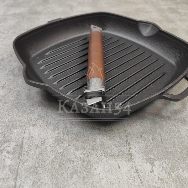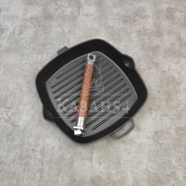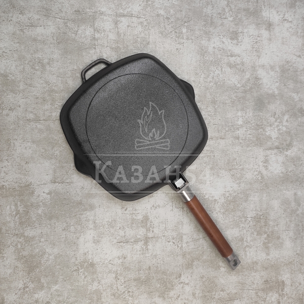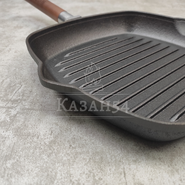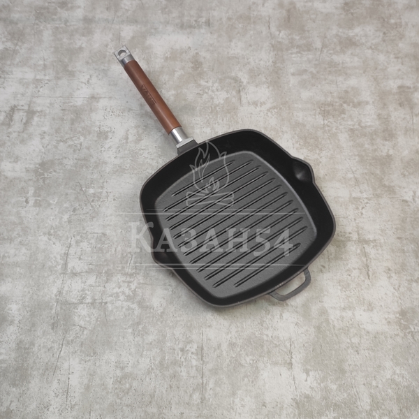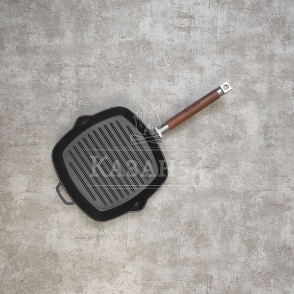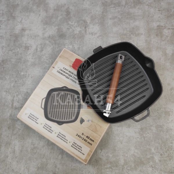 Сковорода-гриль изготовлена из чугуна, прокаленного в пищевом жире, благодаря чему повышаются антипригарные свойства изделия. Одна из главных особенностей данной сковороды - рифленая поверхность, имитирующая решетку гриля образуя аппетитную корочку, при этом жир стекает в желобок.